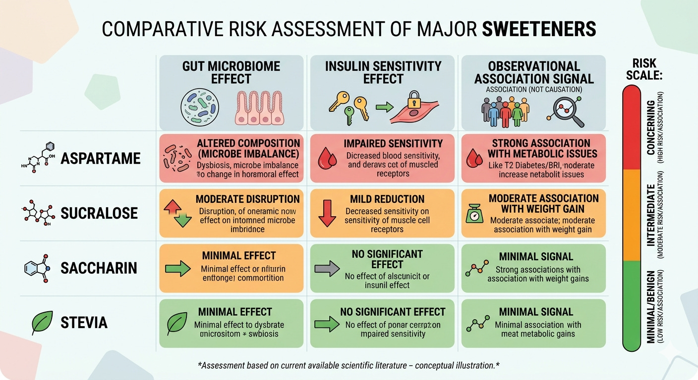 The landmark study in this area is Suez et al., published in Cell in 2022. In a multi-arm randomized controlled trial of 120 healthy adults, participants were assigned to saccharin, sucralose, aspartame, or stevia at doses below the acceptable daily intake for two weeks. Every sweetener distinctly altered gut and oral microbiome composition and plasma metabolome. But the effects were not equal: saccharin and sucralose significantly impaired glycemic responses, while aspartame and stevia showed less pronounced effects. Critically, gnotobiotic mouse experiments confirmed that the glycemic effects were microbiome-mediated — the gut bacteria themselves were the mechanism, not a direct chemical effect of the sweetener.