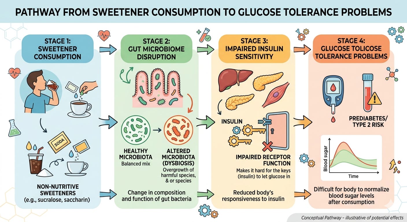 The pathway runs like this: sweetener consumption → altered microbiome composition (dysbiosis) → reduced insulin sensitivity → impaired glucose tolerance. For someone already managing prediabetes or metabolic risk, that chain matters.